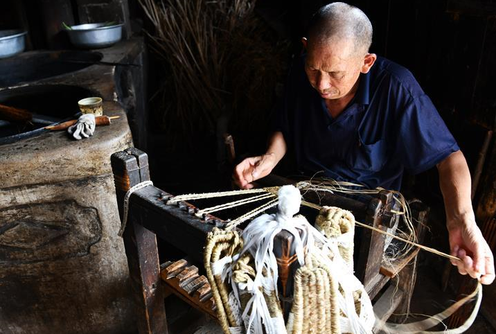 72岁的万塘村老人黄景国坐在屋内,满是褶皱的手指在麻绳间左右翻动,弹出的细小纤维,映着门外照进来的阳光,上下飞舞。