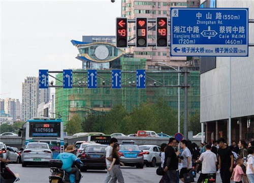 8月25日,七夕节,湖南长沙市人流密集的五一商圈周边多个路口信号灯变成心形。