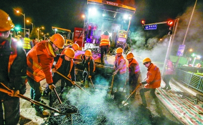 23日零时许,稻香湖路和北清路交叉路口,北京市政路桥养护集团市政三处施工人员正在摊铺沥青混凝土。稻香湖路大修工程将于“五一”前完工。