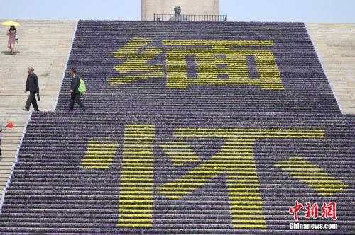 资料图:3月26日,南京雨花台烈士陵园内的烈士纪念碑前布置了由数万盆鲜花组成的“缅怀”花坛,以此表达对革命英烈的纪念之情。中新社记者 泱波 摄