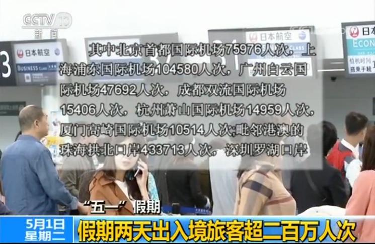 据国家移民管理局通报:截至今天凌晨三点,全国出入境边防检查机关共查验出入境旅客超二百万人次,4月30日当天出境旅客超过一百万。