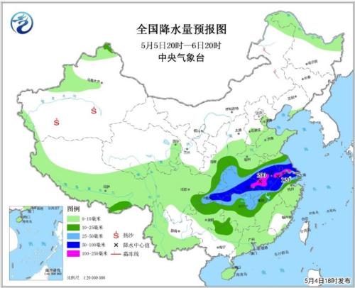 全国降水量预报图(5月5日20时-6日20时) 图片来源:中央气象台