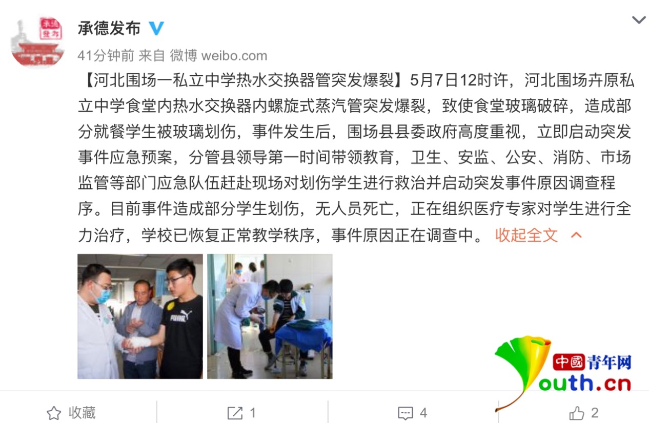 5月7日下午,河北承德市政府新闻办公室官方微博通报称, 12时许,河北围场卉原私立中学食堂内热水交换器内螺旋式蒸汽管突发爆裂,致使食堂玻璃破碎,造成部分就餐学生被玻璃划伤,事件发生后,围场县委政府高度重视,立即启动突发事件应急预案,分管县领导第一时间带领教育,卫生、安监、公安、消防、市场监管等部门应急队伍赶赴现场对划伤学生进行救治并启动突发事件原因调查程序。
