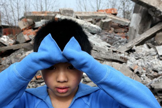 何文东的学校不在震中,但父母常年在汶川县打工,每年相处的时间不过10天,他对父母几乎没有印象。何文东知道见不到父母了,仍然坚持去看看父亲开过的挖掘机。