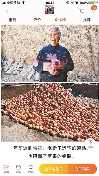 商家在宣传中称,“当地自然环境只适合种苹果,经济收入非常有限。闭塞的交通使得年年丰收的果子烂在眼前卖不出去。”商家还配有当地果农、简陋房屋和大量苹果的照片。