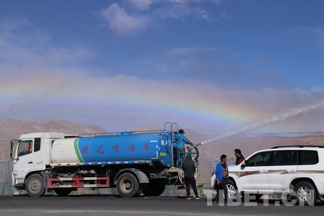 图为绿化喷洒车在天际划出一道彩虹。噶哇扎西摄