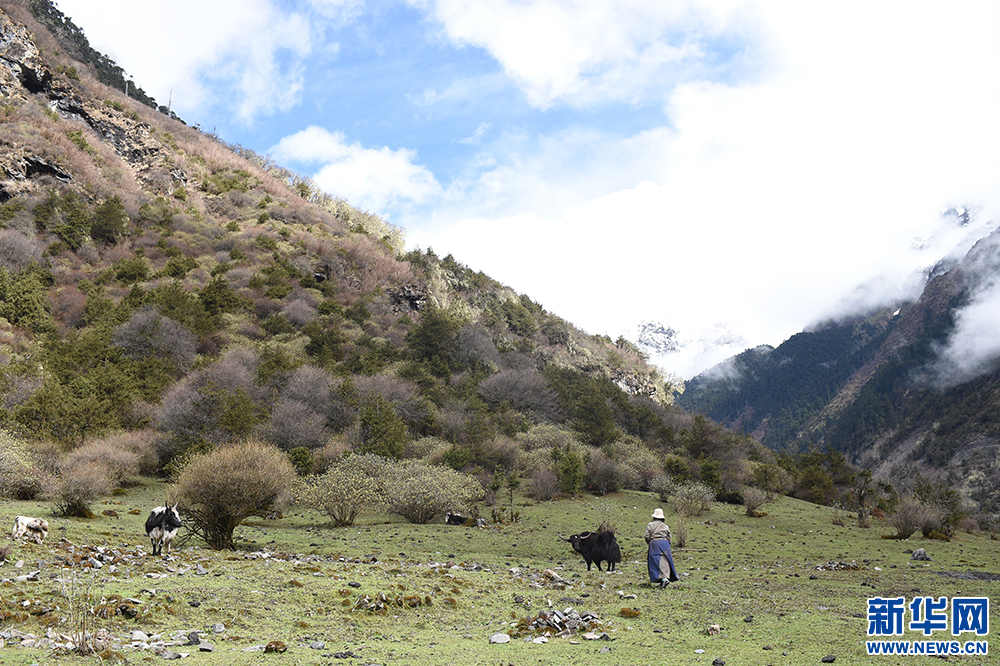 卓嘎在山上喂牛(5月9日摄)。新华网记者 马艺萌 摄
