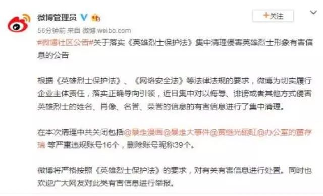 5月17日,新浪微博社区管理官方微博发布《关于落实〈英雄烈士保护法〉集中清理侵害英雄烈士形象有害信息的公告》。