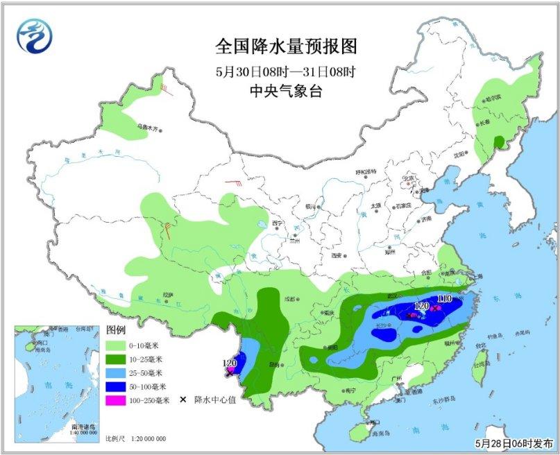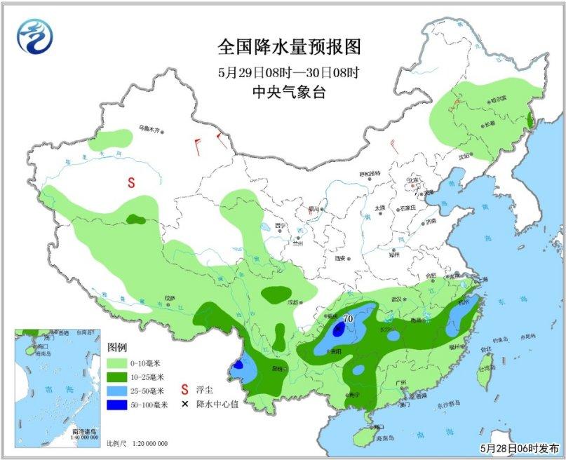 5月30日08时至31日08时,江汉南部、江淮西南部、贵州南部、江南中北部、广西北部、川西高原南部、云南中西部等地有中到大雨,其中,江南北部和西部、云南西部等地部分地区有暴雨,局地大暴雨。新疆东北部、内蒙古中西部等地部分地区有4~5级风。东海北部海域将有4~6级、阵风7级的东北风。