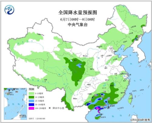 6月7日08时至8日08时,华南南部强降水持续。江南南部、华南中西部、云南西部、青海东北部、甘肃南部、川西高原北部、吉林东部等地有中到大雨,其中,广西北部和南部、广东中部和西南部、海南岛北部等地的部分地区有暴雨,局地有大暴雨(100~150毫米),上述局部地区将伴有短时强降水等强对流天气。南海西北部海域将有5~7级、阵风8级的旋转风。