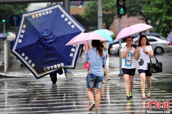 资料图:民众在暴雨中行走。中新网记者 金硕 摄