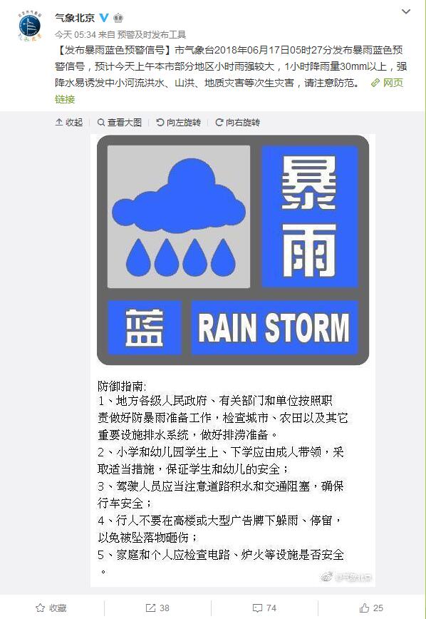 北京市气象台2018年06月17日05时27分发布暴雨蓝色预警信号,预计今天上午本市部分地区小时雨强较大,1小时降雨量30mm以上,强降水易诱发中小河流洪水、山洪、地质灾害等次生灾害,请注意防范。