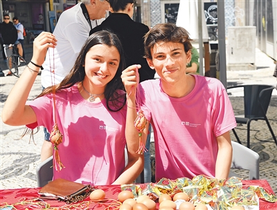 在葡萄牙阿威罗举行的端午龙舟巡游活动开幕式上,阿威罗大学孔子学院的学生展示他们制作的蛋袋。张立云 图屈原精神走向海外