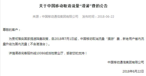 中国移动22日在官网发布公告称,为贯彻落实国家提速降费政策,自2018年7月1日起,中国移动取消流量“漫游”费,新老用户省内流量升级为国内流量(不含港澳台)。