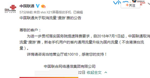 继中国移动之后,中国联通也于同日通过官方微博宣布:自2018年7月1日起,中国联通取消流量“漫游”费,新老手机用户的省内通用流量升级为国内流量(不含港澳台流量)。