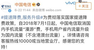 随后,中国电信通过官方微博宣布,自2018年7月1日起,中国电信取消国内手机流量“漫游”费,手机用户省内流量升级为国内流量(不含港澳台流量)。