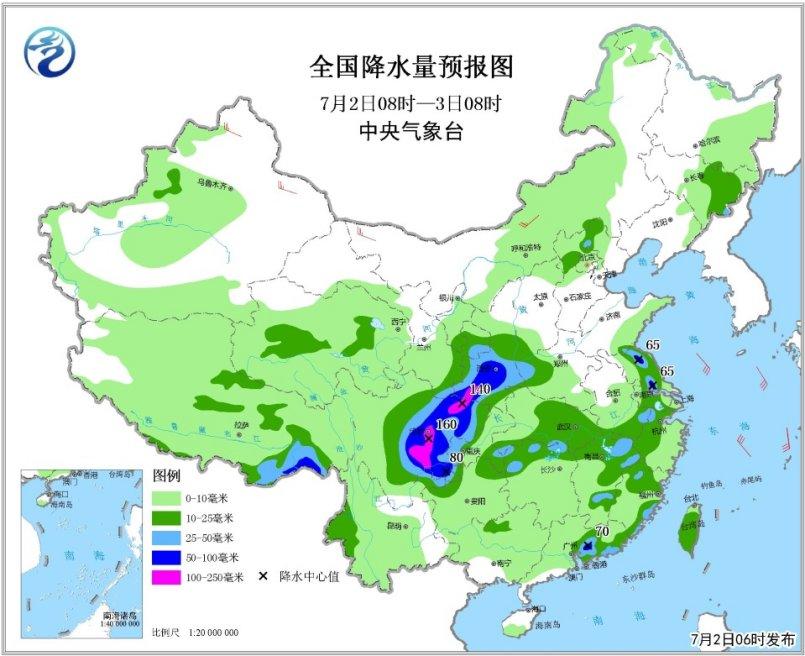 7月3日08时至7月4日08时,青海东部、西北地区东南部、西南地区东北部、黄淮西部、江淮西部和南部、江汉中北部、江南东北部、西藏东南部等地有中到大雨,其中,四川盆地东北部、陕西南部等地局地有暴雨到大暴雨(75~130毫米);上述局部地区将伴有短时强降水等强对流天气。东海东北部将有8~10级大风,台风中心经过的附近海域风力有11~12级、阵风13~14级,黄海东南部有7~8级、阵风9级的东北风。