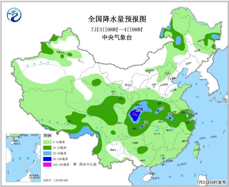 7月4日08时至5日08时,四川盆地南部、黄淮西部和南部、江淮北部和东部、江汉大部、贵州北部、西藏东南部、云南西部等地有中到大雨,其中,湖北西部、河南东部、安徽北部、江苏中部、重庆东北部等地部分地区有暴雨,局地大暴雨(100~140毫米)。