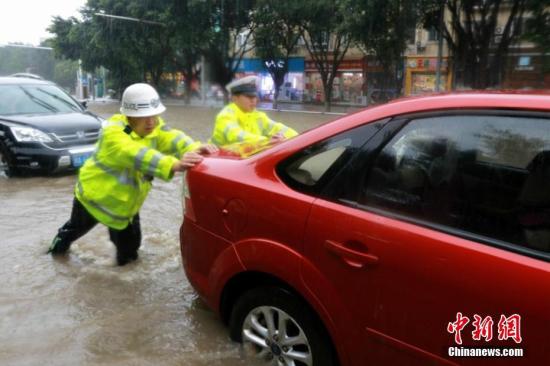 资料图:两交警助推一滞留水中车辆。杨建 摄
