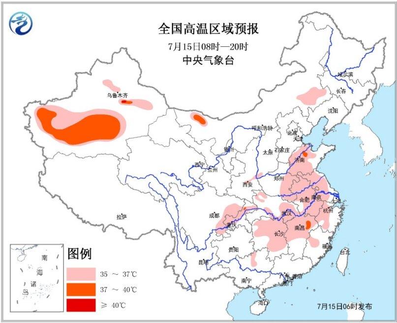 预计7月15日白天,黄淮、江淮、江汉南部、江南中北部、四川盆地中东部、重庆、新疆南疆盆地等地的部分地区最高气温有35~36℃,山东西北部、江西东北部、新疆南疆盆地等地可达37~39℃。中央气象台7月15日06时继续发布高温黄色预警(见图2)。