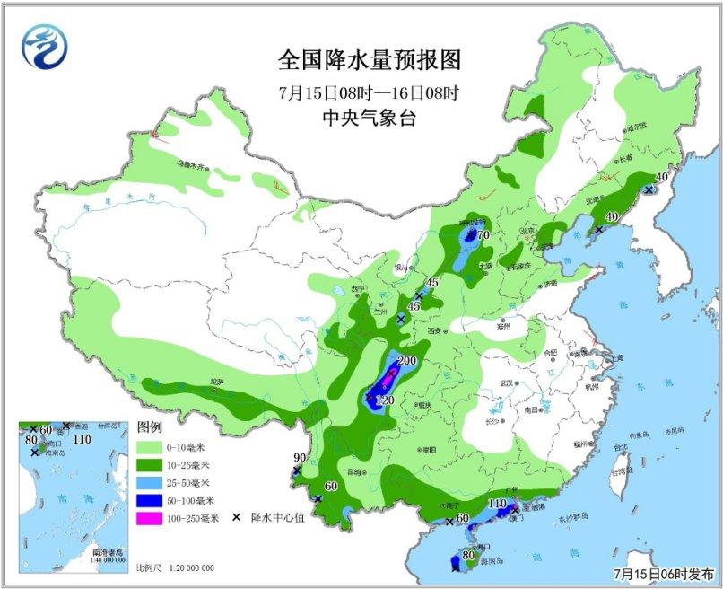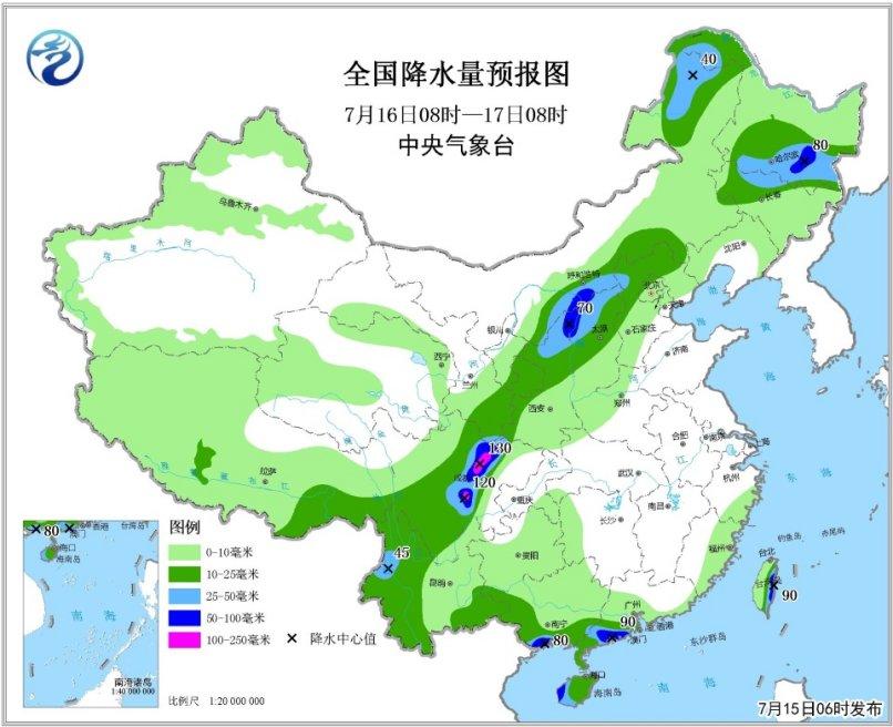 图3 全国降水量预报图(7月15日08时-16日08时)