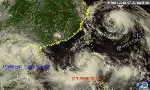 目前,台风“安比”和南海东北部生成的热带低压之间的相互牵制作用较为突出。