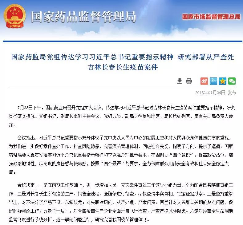 7月23日下午,国家药监局召开党组扩大会议,传达学习习近平总书记对吉林长春长生疫苗案件重要指示精神,研究贯彻落实措施。党组书记、副局长李利主持会议,党组成员、副局长徐景和出席,局长焦红列席,局有关司局负责人参加。