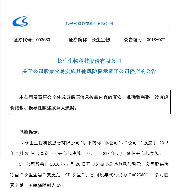 长生生物7月24日晚间发布公告,7月25日开市起停牌一天,公司股票交易将被实施其他风险警示,股票简称由“长生生物”变更为“ST 长生”,涨跌幅限制为 5%。