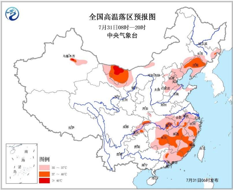 未来三天南方地区高温范围减小,强度减弱,北方地区高温加强。中央气象台7月31日06时继续发布高温黄色预警:预计7月31日白天,华北中东部、辽宁大部、吉林南部和东部、重庆、江汉中东部、江淮南部、江南、华南东部及新疆吐鲁番盆地、内蒙古西部等地最高气温有35~36℃,其中,辽宁中北部、重庆北部和东部、湖北南部、湖南东部、江西中部、浙江中南部、安徽南部、福建东部和北部以及吐鲁番盆地、内蒙古西部等地的部分地区最高气温37~39℃,局地可达40℃。