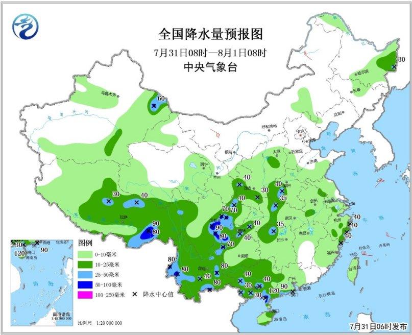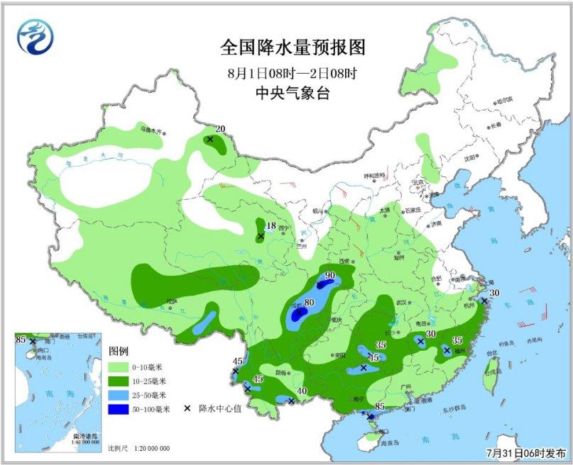 图2 全国降水量预报图(7月31日08时-8月1日08时)