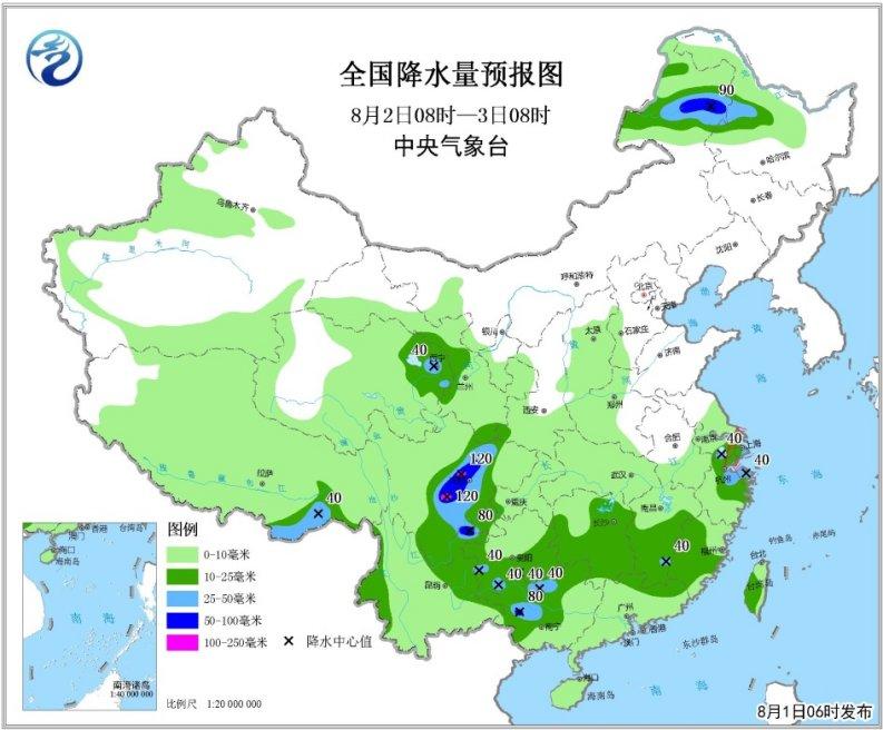 8月3日08时至4日08时,内蒙古东部、黑龙江中部、江淮大部、江南北部和南部、西南地区大部、华南北部和西部等地的部分地区有中到大雨,其中,内蒙古东北部、黑龙江中部、安徽中南部、江苏南部、浙江北部、四川盆地西部、云南东北部和西南部等地部分地区有暴雨,局地大暴雨(100~120毫米)(见图6)。