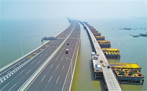 这是正在施工的新建福厦铁路泉州湾跨海大桥(右侧)与已经通车的泉州湾跨海大桥公路桥(7月31日无人机拍摄)。 近日,福建多地持续高温,位于福建省石狮市境内的新建福厦铁路泉州湾跨海大桥施工正紧锣密鼓进行。为确保大型机械能按时顺利入场,当地供电部门加紧进行配套电网基建施工。新建福州至厦门高速铁路是国内首条跨海高铁,其中泉州湾跨海大桥全长约20.3公里,海上部分长9公里。 新华社记者 宋为伟摄