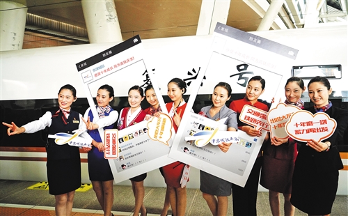 8月1日,京津城际铁路开通运营满10周年。在北京南站,身着不同乘务服装的京津城际车队乘务员在“复兴号”前合影留念。本报记者翟天雪摄