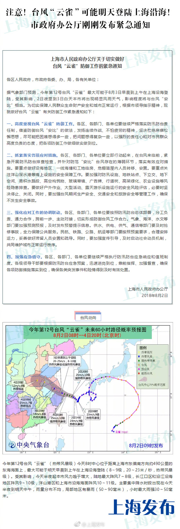 通知称,今年第12号台风“云雀”(热带风暴级)今天8时中心位于距离上海市东偏南方向约490公里的东海海面上,最大可能于明天早晨到上午在上海沿海登陆(8~9级,20~23米/秒,热带风暴级)。预计2日夜里到3日白天本市将出现明显风雨天气,影响程度将与台风“安比”相当。