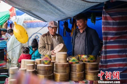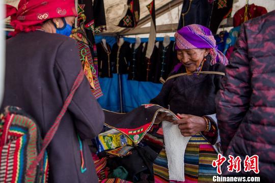 中新网西藏山南8月5日电 (何蓬磊)“这种帮典(藏式围裙)怎么卖的?是纯羊毛的吗?”“320元,不仅是纯羊毛的而且都是纯手工的。”4日,在山南浪卡子县打隆边贸物资交流会上,73岁的欧杰旦增老人在他的传统手工艺店里应声道。