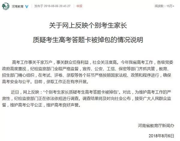 6日晚,河南省教育厅新闻办发布回应称,针对此事,纪检监察部门正在依法依规进行调查。调查结果将及时向社会公布,接受广大人民群众监督,维护高考公平公正,维护高考良好声誉。