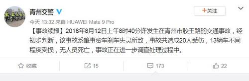 中新网8月12日电 据潍坊市公安局交通警察支队青州交通警察大队官方微博消息,今天上午8时40分许,一货运汽车沿青州胶王路由西向东行至涝埠路口东侧发生交通事故,经初步判断,该事故系肇事货车刹车失灵所致,事故共造成20人受伤,13辆车不同程度受损,无人员死亡,事故正在进一步调查处理过程中。