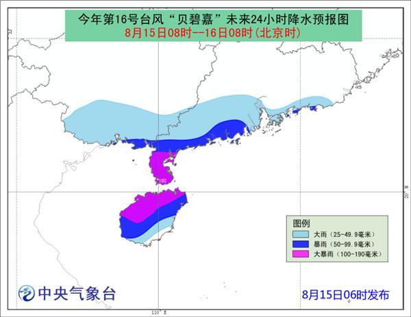 降水预报:8月15日08时至16日08时,华南南部有大到暴雨,其中,雷州半岛、海南岛西北部部分地区有大暴雨(100~190毫米)。
