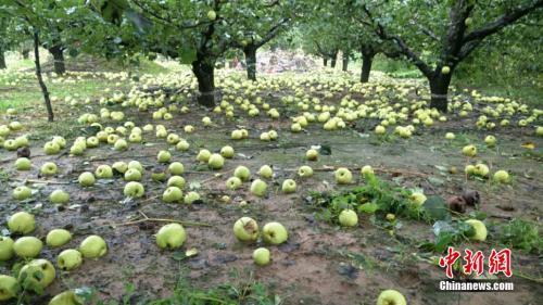 受台风“温比亚”影响,风雨致安徽省砀山县受灾,农作物损失严重。图为梨园里被吹落的梨子。