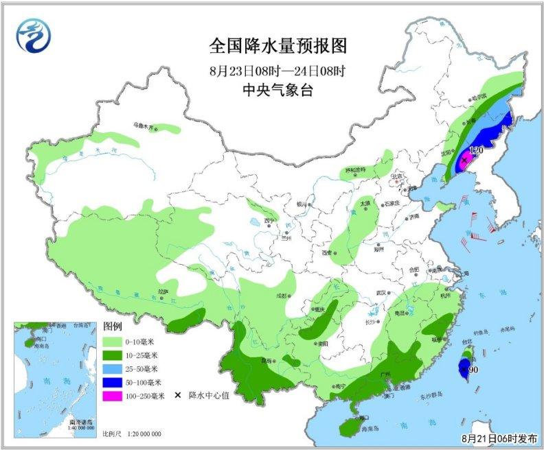 8月23日08时至24日08时,福建东北部、东北地区东部、西南地区西南部、华南东部和南部及台湾岛等地的部分地区有中到大雨,其中,吉林东部、辽宁东部和台湾岛南部等地部分地区有暴雨,局地大暴雨(100~120毫米)。黄海中部和南部海域、东海北部的偏北海域将有9~10级大风,台风中心经过的附近海域风力可达11~14级、阵风16~17级,黄海北部海域将有6~8级、阵风9级的东北风,渤海将有5~6级、阵风7级的东北风,东海东南部海域、台湾以东洋面、巴士海峡、南海大部海域将有5~7级、阵风8级的西南风。