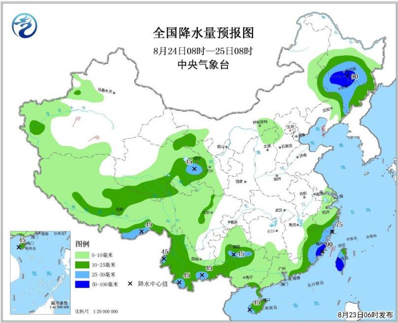 8月24日08时至25日08时,黑龙江南部、吉林、辽宁北部、江南东南部、广东东部、海南岛、广西西部、贵州南部、云南南部和西部、西北地区中部、西藏东部以及台湾岛等地的部分地区有中到大雨,其中,黑龙江南部、吉林北部、浙江东南部、福建东部以及台湾岛南部等地局地有暴雨(50~90毫米)。新疆南部和东部的部分地区有4~6级风,南疆盆地有扬沙或浮尘天气。黄海北部和中部海域将有6~8级、阵风9级的大风。