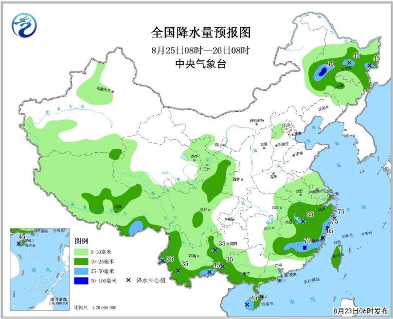8月25日08时至26日08时,黑龙江中南部、吉林西北部、江南中东部、华南西南部、海南岛、贵州西部、云南西部和南部、四川盆地西北部、西北地区东部、西藏中东部以及台湾岛等地部分地区有中到大雨,地局暴雨(50~90毫米)。