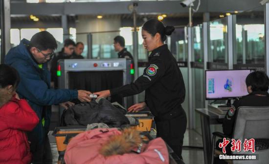 资料图:机场安检中心工作人员在安检旅客物品。中新社记者 于海洋 摄