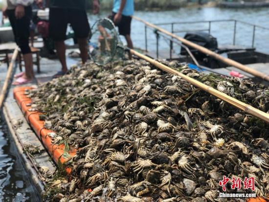 8月29日上午,江苏省泗洪县临淮镇党委书记王志明介绍,由于上游泄洪污水过境,该镇数万亩水产养殖区受损严重,其中胜利村的12600余亩蟹塘几近绝收。刘林 摄
