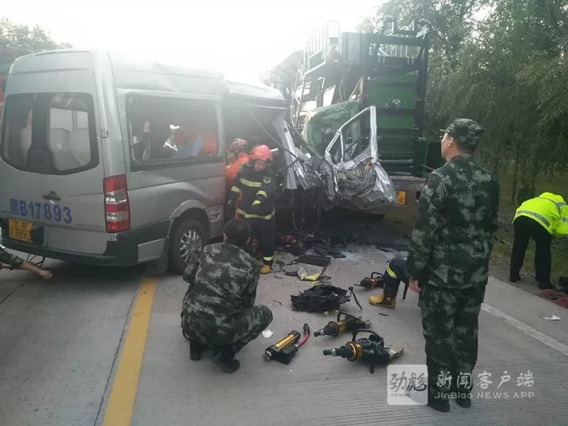 8日17时40分,在碾北公路45公里+339米处,一辆途径龙江县的黑B17893金龙牌中型客车与一辆黑BL1636号牵引车牵引的黑BC466挂车追尾相撞。
