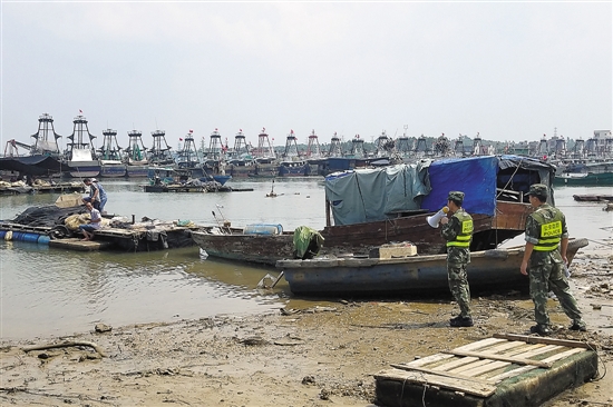 湛江边防支队企水边防派出所官兵劝说渔民上岸避风 袁增伟 钱梦秋/摄