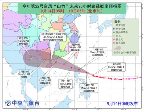 中新网9月14日电 据中央气象台消息,今年第22号台风“山竹”今晨强度仍为超强台风级,中心附近最大风力17级以上(65米/秒),中心最低气压910百帕。预计,“山竹”将于15日凌晨登陆或擦过菲律宾吕宋岛北部沿海,15日中午前后移入南海东部海面。16日夜间到17日凌晨将在广东西部到海南东部一带沿海登陆,预计登陆时强度为强台风级或超强台风级(14~16级,45~52米/秒)。
