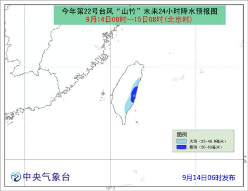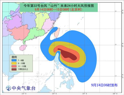 受“山竹”影响,14日08时至15日08时,南海中东部和东北部、台湾海峡、巴士海峡大部、台湾以东洋面有7~8级大风,阵风9~10级;其中南海中东部和东北部部分海域、巴士海峡中南部有9~11级大风,阵风12~13级;菲律宾以东洋面风力最大可达16~17级以上;台湾东部的部分地区有中到大雨,局地有暴雨(50~60毫米)。