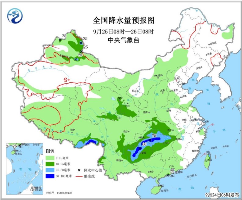 图2 全国降水量预报图(9月25日08时-26日08时)