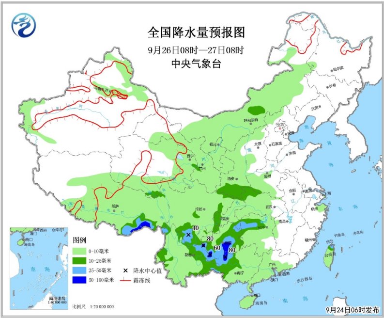图3 全国降水量预报图(9月26日08时-27日08时)
